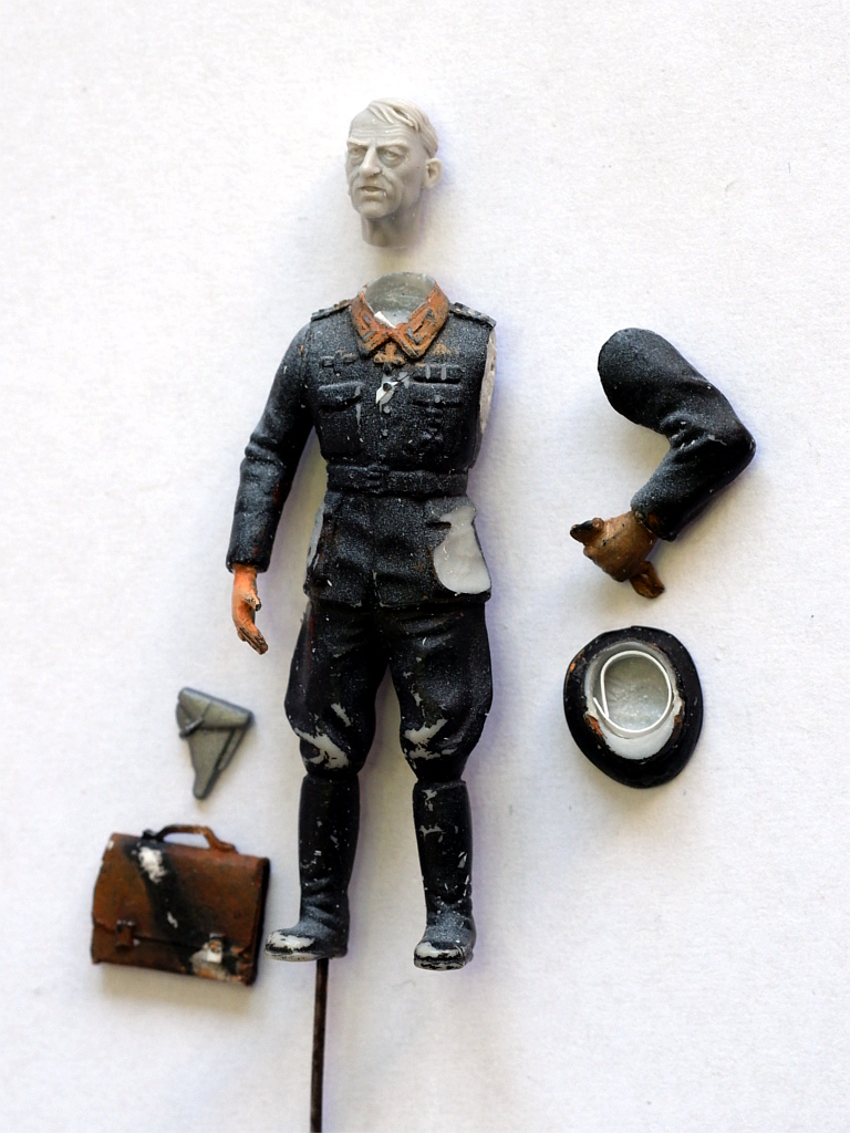 Einige Details habe ich ergänzt, wie zum Beispiel die Schulterklappen oder die Mützenbänder. Die Aktentasche entstand vollständig im Eigenbau.
