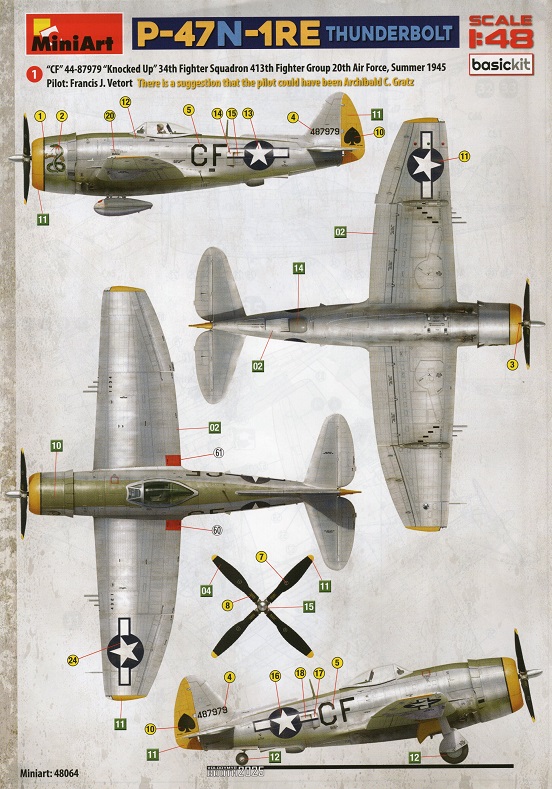 Die P-47 N kam erst spät zum Einsatz und wurde mit 1816 Maschinen in verhältnismäßig geringen Stückzahlen produziert. Für den Krieg in Europa kam sie nicht mehr rechtzeitig, demzufolge gab es auch nur wenige mit ihr ausgerüstete Staffeln. Die Konsequenz: Eine überschaubare Anzahl an Vorbildern für Modellbauer.