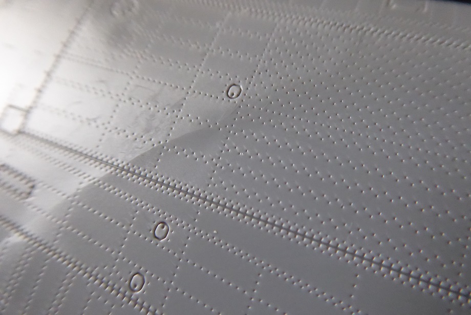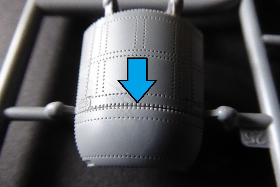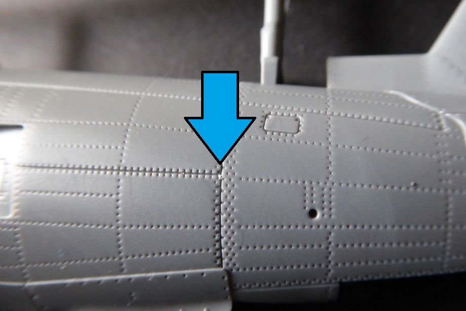Der Bausatz hat also unbestritten seine Qualitäten, aber es gibt auch Schattenseiten. So ist die Nietenstruktur für meinen Geschmack etwas zu intensiv dargestellt, auch wenn ich sonst ein Freund der wohl dosierten Übertreibung bin. In der Nähe einiger Gravur-Linien ist das Plastik bei der Produktion nicht komplett um die Nieten herumgeflossen. Dadurch entsteht eine Art Reisverschlussoptik, die negativ auffällt und mit dem Original nichts mehr zu tun hat! Ich habe zwei Beispiele davon mit Pfeilen auf den Fotos markiert. Nächster Kritikpunkt ist die hohe Anzahl der Teile. Sie ergibt für mich nicht immer Sinn, wie z. Bsp. beim Fahrwerksschacht. Auch hier wäre weniger mehr gewesen. Der Bausatz erscheint insgesamt etwas “overengineered.”