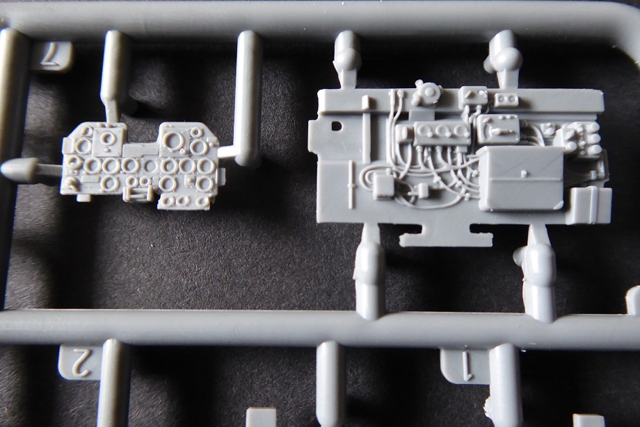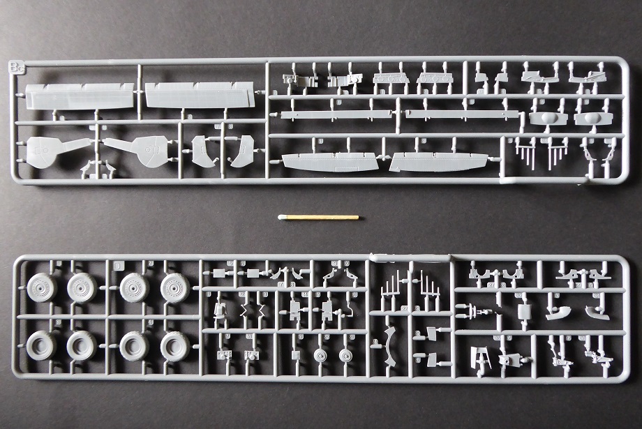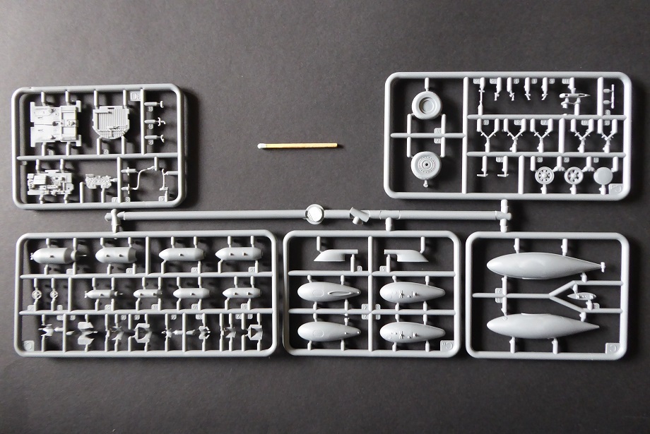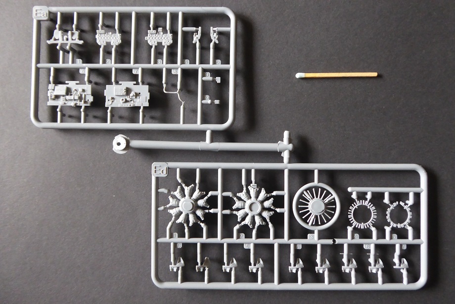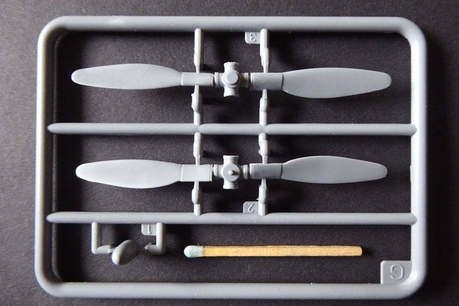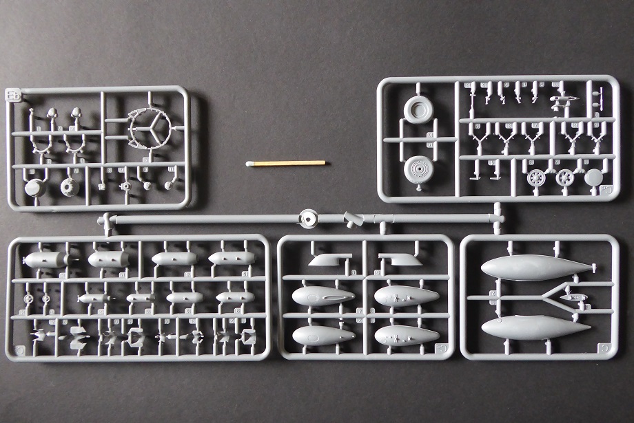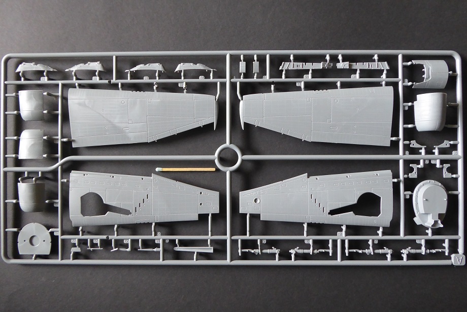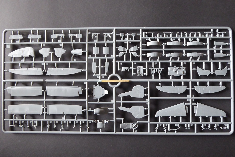 Nun aber liegt mit dem Exemplar von MiniArt ein Bausatz vor, der wirklich als “State of the Art” bezeichnet werden kann. Hier ist alles anzutreffen, was der anspruchsvolle Modellbauer von einem Bausatz erwartet: Hoher Detaillierungsgrad, feine Gravuren, wahlweise abgeplattete Reifen, separate Ruder und sogar abgespreizte Kühlerklappen. Die Triebwerksverkleidung ist in vier Teile untergliedert. Das macht den Bau etwas kompliziert. Dafür freut sich aber der Diorama-Fan, dem vielleicht eine Szenerie mit Wartungsarbeiten am Triebwerk vorschwebt. Auch bei den makellosen Klarsichtteilen wurden keine Details wie z. Bsp. Nietenstrukturen vergessen. Auffällig sind die vielen Flussmarken im Plastik. Man kann also genau sehen, welchen Weg der noch flüssige Kunststoff seiner Zeit genommen hat.