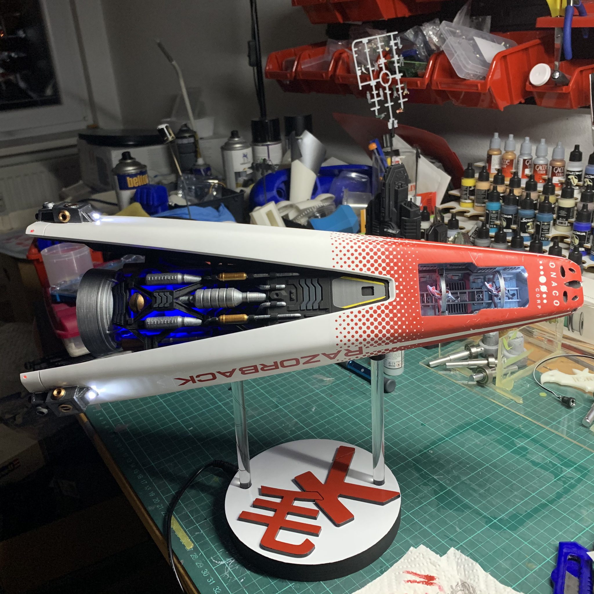 Der leuchtend orangene Kopf wurde zuerst mit metallischen Lack überzogen, bevor er orange wurde. Dies ermöglicht es später mittels Schleifpapier, ihn abgenutzt wirken zu lassen.
